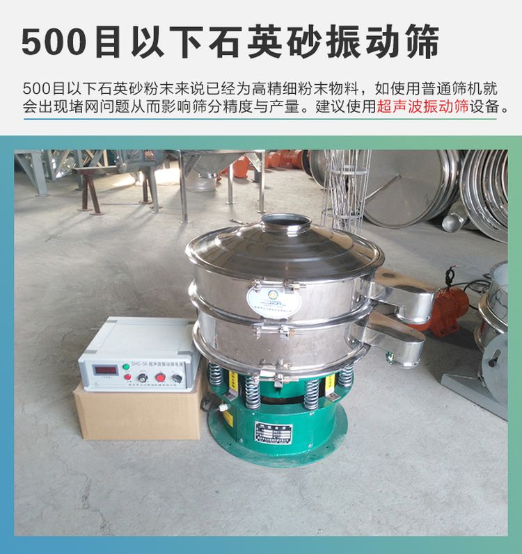 對于500目以下石英砂粉末來說已經(jīng)為高精細(xì)粉末物料,如使用普通篩機(jī)就會出現(xiàn)堵網(wǎng)問題從而影響篩分精度與產(chǎn)量。對于該類型的石英砂產(chǎn)品就需要使用到另一款篩分設(shè)備-超聲波振動篩。該系列篩機(jī)的清網(wǎng)裝置使用的是超聲波系統(tǒng),開啟后篩面會形成一個高頻低振幅的超聲振動波,使高精細(xì)粉末低空懸浮在篩面粗從而實(shí)現(xiàn)清網(wǎng)及解決堵網(wǎng)問題。