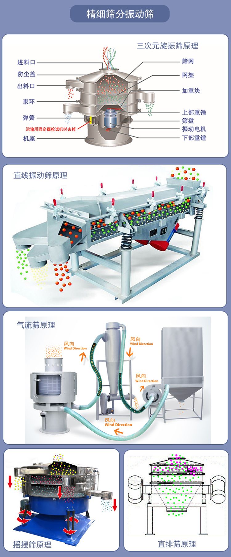 直排篩的原理是通過(guò)振動(dòng)源的作用使物料在篩面做三維運(yùn)動(dòng),這種運(yùn)動(dòng)方式可以使結(jié)塊物料散開(kāi),快速的通過(guò)篩網(wǎng)。精細(xì)物料直接由下部排出,雜物粗料則通過(guò)排渣出料口排出。