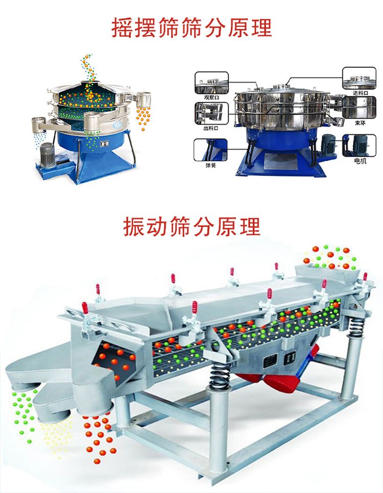 搖擺篩是模仿人工篩分,物料在篩面做非線性的三維運(yùn)動,既有圓周運(yùn)動,又有上拋弧運(yùn)動,而振動篩是采用雙電機(jī)或直立式電機(jī)驅(qū)動,物料運(yùn)動軌跡是一臺直線或者水平、傾斜、垂直的三次元運(yùn)動。